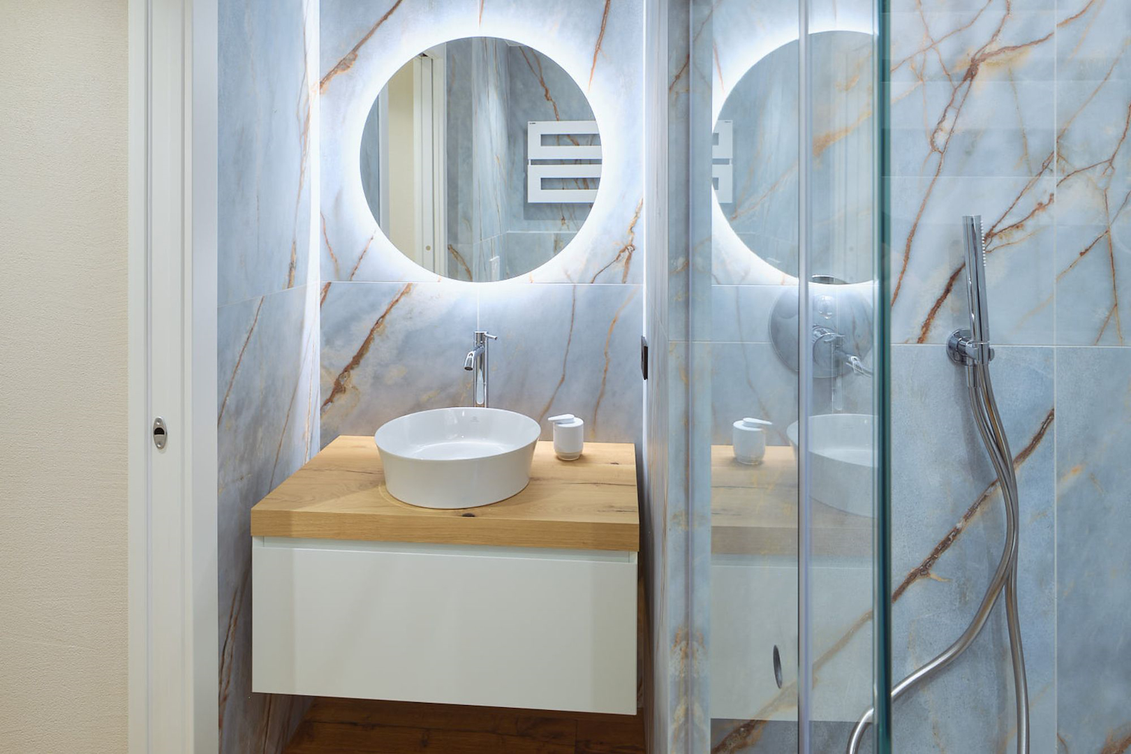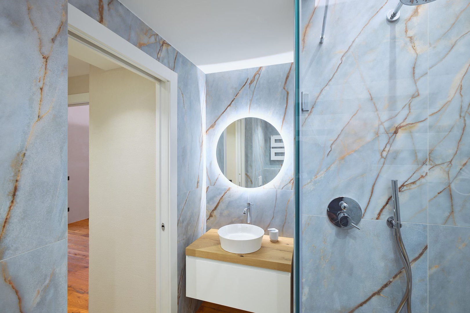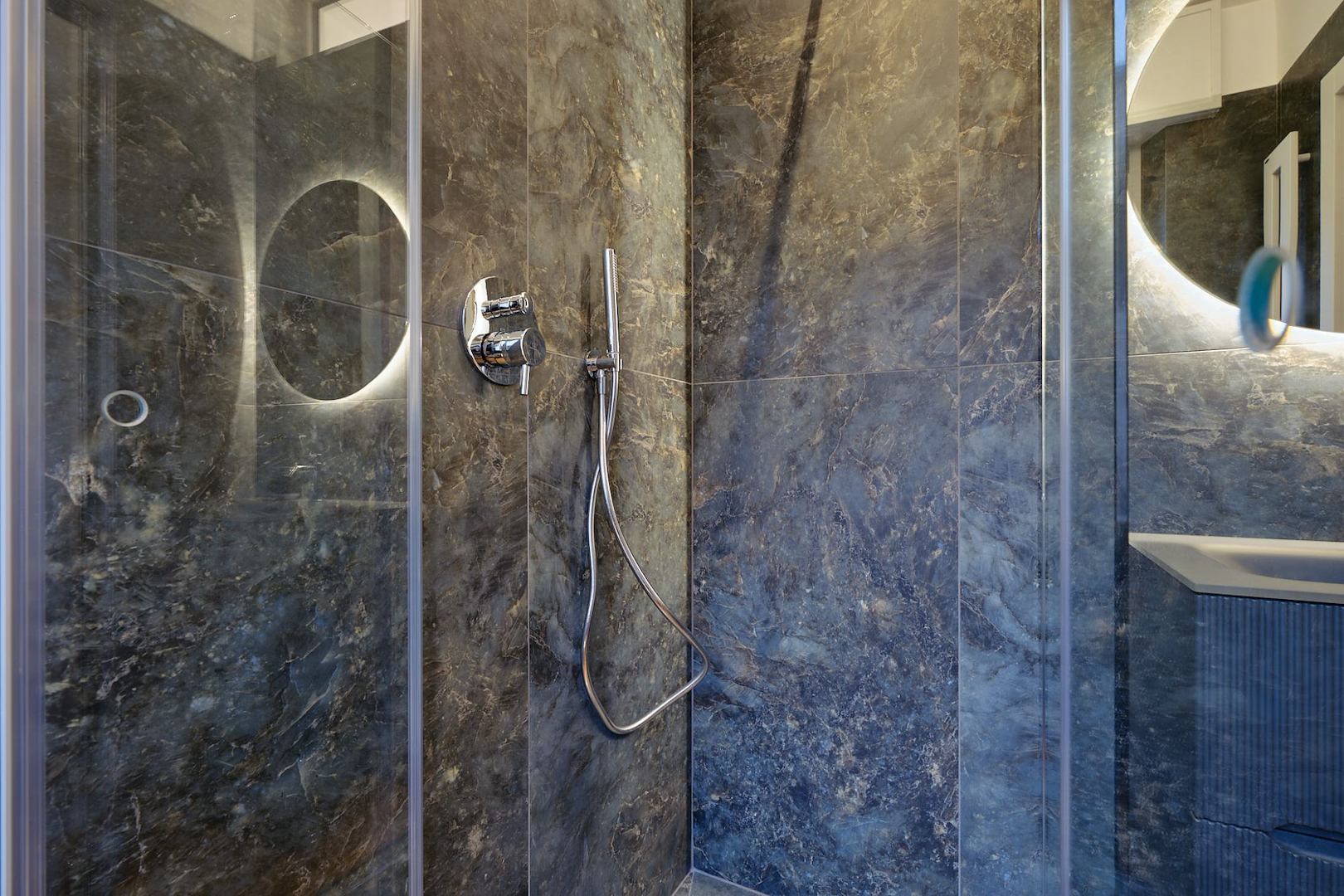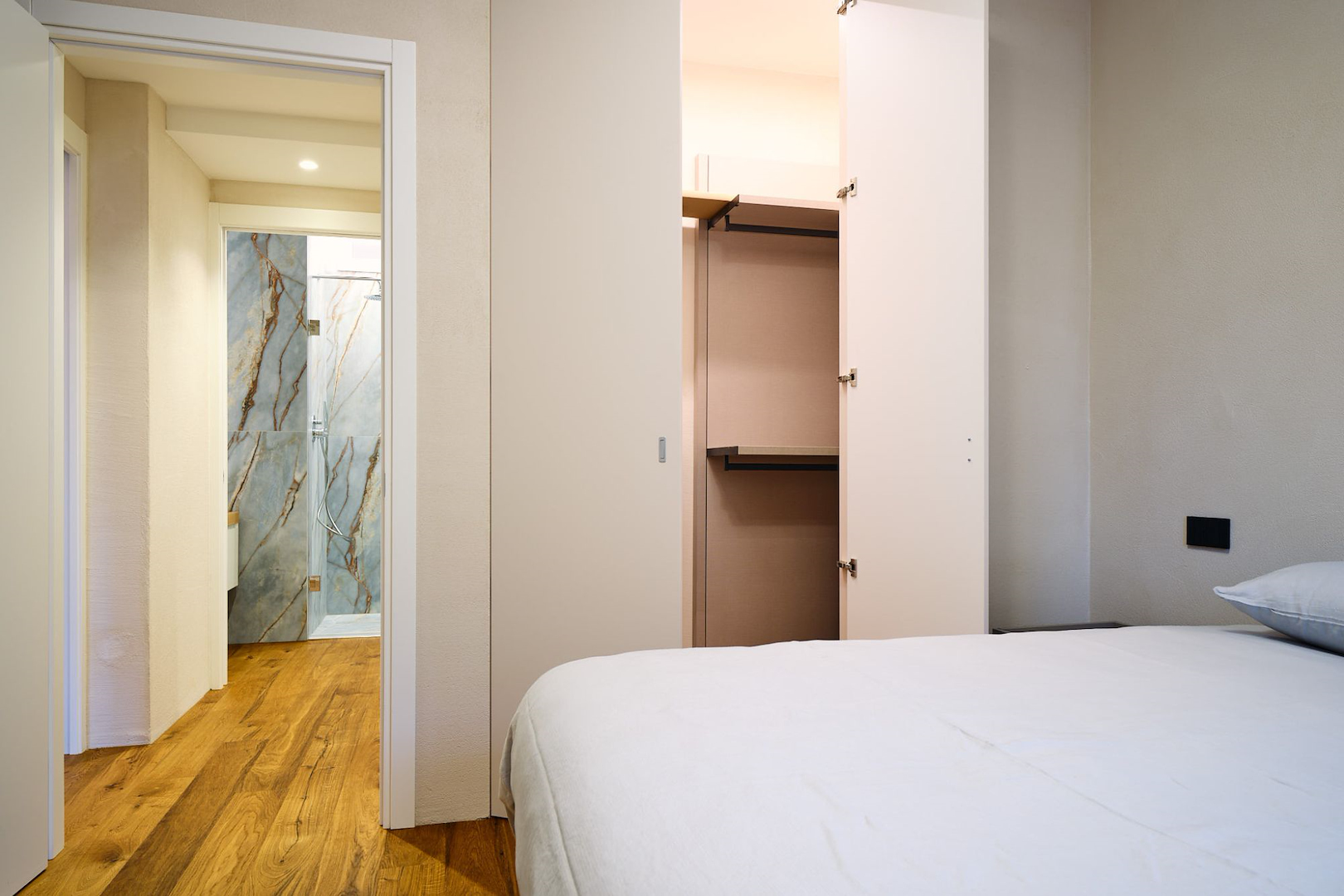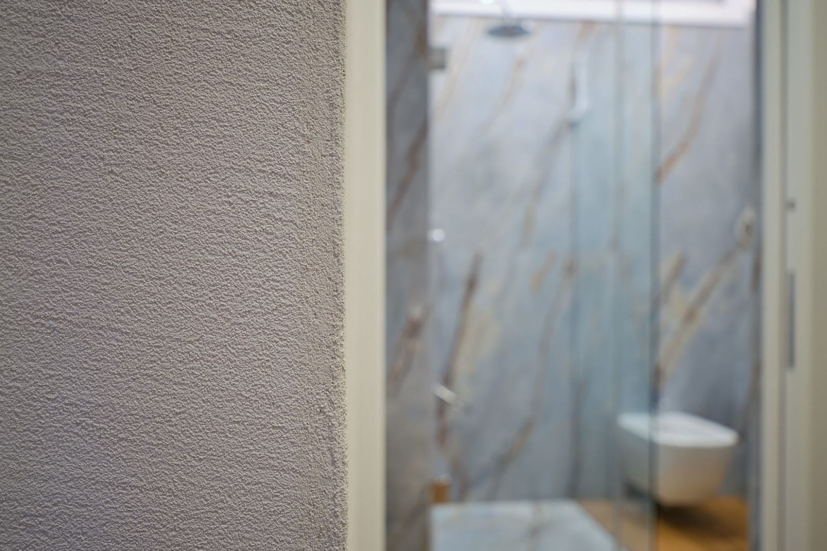Il concept progettuale ha puntato su un equilibrio tra innovazione e calore. Le superfici effetto pietra dei bagni si intrecciano con le calde tonalità del legno, dando vita a un ambiente dove ogni dettaglio racconta una scelta consapevole. Una scelta studiata assieme in showroom e realizzata dal nostro ufficio tecnico interno per dar vita a ogni dettaglio su misura.
